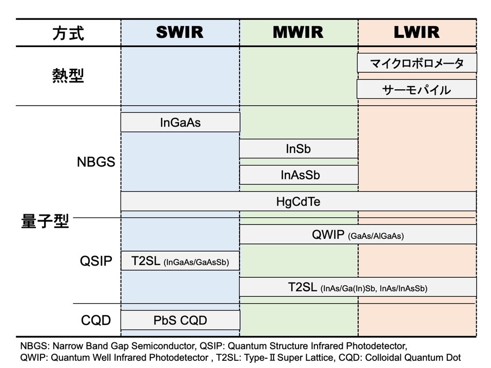 赤外線の波長帯の分類については分野ごとに定義が異なるが、赤外線センサの分野では、SWIR (Short-Wavelength Infrared, 1〜3µm)、MWIR (Middle-Wavelength Infrared, 3〜5µm)、LWIR (Long-Wavelength Infrared, 8〜14µm) の3つの波長域に分けることが多い。赤外線センサとしては、NIR(Near infrared, 0.7〜1µm)も対象となるが、可視光センサであるSi検出器などが使える波長域であり、本稿では対象から外している。