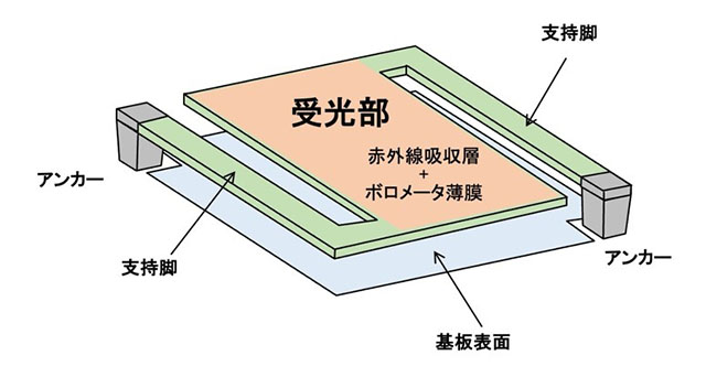 図2に表面マイクロマシニング技術で作製されるマイクロボロメータの画素構造を示す。赤外線吸収層と抵抗ボロメータ薄膜層からなる受光部は、2本の細長い支持脚で支えられ、基板と断熱されている。この断熱構造を用いることで、吸収した赤外線を効率よく受光部の温度変化に変換することができる。温度変化はボロメータの抵抗変化として検出する。一方、サーモパイル赤外線センサは、バルクマイクロマシニング技術でSiバルク内のSiを除去して受光部となる薄膜メンブレンを中空に浮かせて断熱する構造が一般的である。