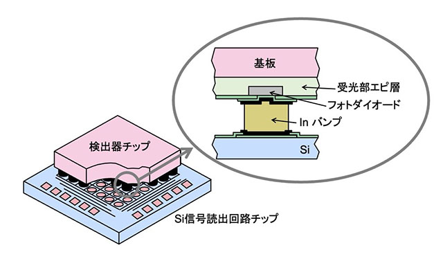 量子型MW/LW赤外線センサは、化合物半導体や化合物半導体基板上のエピ構造を用いており、信号読出回路を同じ基板上に集積化することは困難である。そのため、この種の量子型MW/LW IRFPAでは、図3に示すようなハイブリッド構造が採用されている。この構造では、信号読出回路を作製したSiチップと、化合物検出器チップを画素毎にInバンプで接続している。ハイブリッド構造は、画素ピッチ縮小と多画素化が難しい構造であるが、すでに画素ピッチが5 µmの5M画素のMWIR FPAが市場投入されている15)。
