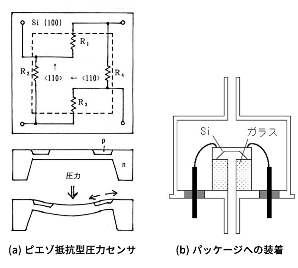 シリコンの薄いダイアフラムが圧力差で変形するのを、ダイアフラム上に形成した拡散層の抵抗変化として測るピエゾ抵抗型圧力センサ(図1(a))は、1980年代から自動車のエンジン制御に用いられた1)。センサの装着(パッケージング)を工夫し、図1(b)のようにシリコンと熱膨張が近いガラスを介して容器に取り付けて温度の影響を受けないようにしている。エンジンの吸気部に取り付け気圧の変化に対応して燃料の噴射を調節することで、不完全燃焼などを避け環境浄化に貢献した。圧力センサにはダイアフラム両側の圧力差を測る相対圧型の他に、片側は真空など一定の圧力にする絶対圧型もある。