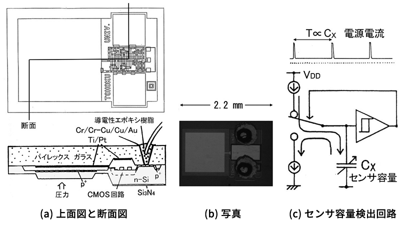 ダイアフラムの動きを静電容量の変化として検出する容量型圧力センサもある。図2の例は容量検出用の集積回路を内蔵した集積化容量型圧力センサで、内蔵することで寄生容量の影響を受けずに高感度になり微小圧力を検出できる2)。これでは集積回路を形成したシリコンウェハにガラスをウェハ状態で陽極接合し、チップに切り離すことでパッケージングに入った形に製作するウェハレベルパッケージング技術を用い、小形で安価に製作することができる。これはエアコン用フィルタの目詰まり検知などに用いられた。