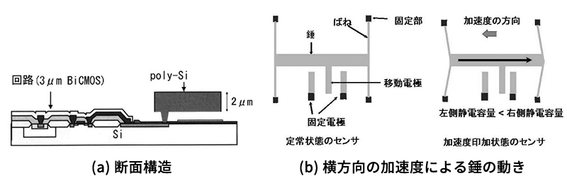 動いたときの慣性力によりばねで支えられた錘が動くのを検出する加速度センサは、1990年代から自動車の衝突を検出してエアバックが膨らみ乗員を保護するのに使われている。図3は米国のアナログデバイス社において開発され衝突検出に用いられた加速度センサである3)。BiCMOS集積回路の上に加速度センサが作られている(図3(a))。これは犠牲層と呼ばれるリンガラスの上にポリシリコンの構造があり、犠牲層をエッチングで除去することにより、横方向の加速度によりばねで支えられた錘が動いて静電容量が変化する構造が作られている(図3(b))。この作り方は米国のUCバークレーで開発されたもので「表面マイクロマシニング」と呼ばれる。錘の動きを静電容量の変化で検出するための回路が集積化されている。2軸の集積化加速度センサや、錘を静電アクチュエータで動かして動作を確認する自己テスト機能が搭載されたものもある。