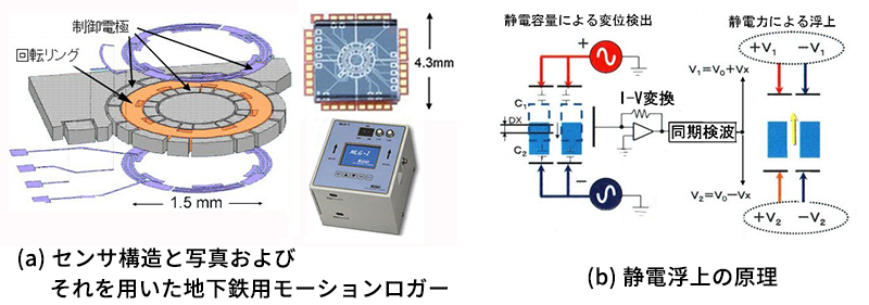 図6(a)に示すものは静電浮上回転ジャイロと呼ばれ、3軸加速度と2軸周りの角速度を測定できるものである7)。東京計器㈱で開発され、東京の地下鉄で車体の動きを検出しモーションロガーに記録している。外径1.5mmのシリコンのリングが高速ディジタル制御で浮上して毎分7.4万回転し、回転軸に直交する2軸周りの角速度を高精度に検出できる。錘は3方向の静電容量で位置を検出して静電引力で浮上させる(図6(b)は上下方向の制御)。またリングの回転位置を静電容量で検出し、必要な電圧を印加して静電引力で回転させている。なお静電浮上回転ジャイロは、米国の原子力潜水艦の航行制御に用いられたもので、当時(1964年)は真空管がその制御に用いられた8)。普通の航行制御には人工衛星からの電波によるGPSが用いられているが、潜水艦の場合は海の中で電波が届かないため、このような昔ながらのジャイロコンパスが用いられてきた。