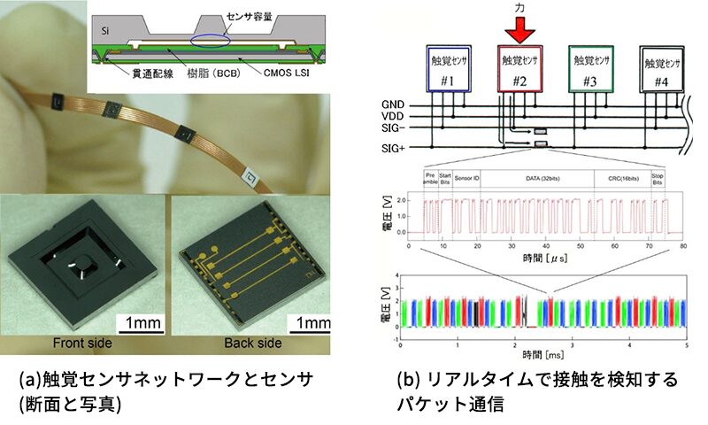 図7で安全な介護ロボットのための触覚センサネットワークを紹介する9)。これは東北大学とトヨタ自動車や豊田中央研究所で開発されたもので、ロボットの体表にフレキシブル基板に付けた触覚センサを分布させ、リアルタイムで接触を検知できるようにしたものである。このため、図7(a)のように高密度集積回路のチップ上に接触を容量変化で検知するセンサを付け、クロック速度40MHzのパケット通信で接触をリアルタイムで検知する。