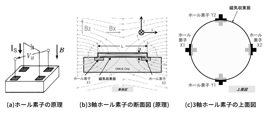 磁気センサは地磁気を測り方向を知る磁気コンパスとして、スマートホンなどで用いられており、図11はその例である。同図(a)はその要素となるホール素子で、垂直のZ方向の磁場によって電流Isが曲げられて電圧VHが発生し磁場を知ることができる。3方向の磁場を検出するには同図(b)(c)のようにCMOS回路と4個のホール素子を載せたチップ上に強磁性体による磁気収束板を置くことにより、その端部でX方向やY方向に磁界が曲げられてZ方向になるので3軸磁気センサとして使用できる15)。なおホール素子は電磁モータで回転角度を検出することで、ブラシレスモータに役立っている。