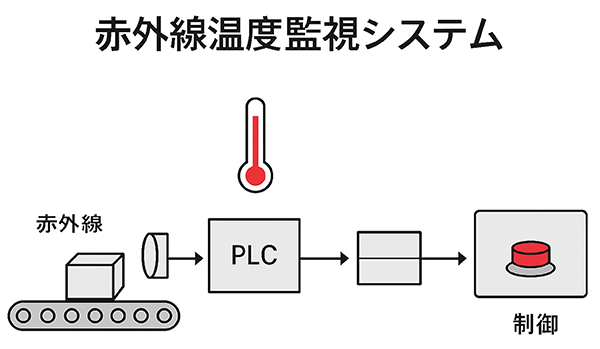 赤外線温度センサが装置表面やワーク温度を常時監視し、しきい値を超える異常加熱が検知された場合、PLC経由で自動停止する構成が一般的である。