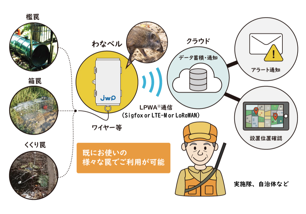 狩猟罠の作動をリアルタイムに検知し、携帯電話に通知 省電力広域無線通信技術「LPWA」を利用 乾電池で長期間動作