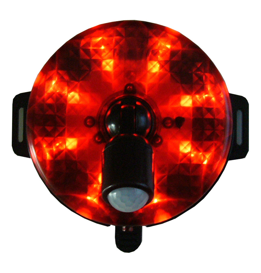 人(動物)の動きを感知して、赤い光(回転又は点滅)とアラーム音で20秒間警告 検知方式:人感センサー 感知範囲:120度×最大5m 防雨形 IP43 音量:95dB/1m、55dB/1m