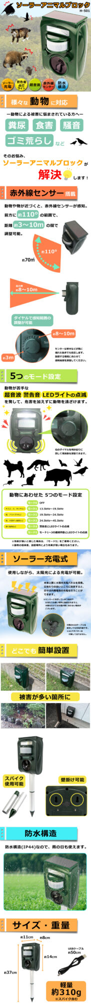 超音波とライトで鳥・動物を忌避 検知方式:赤外線センサー 感知範囲:3~10m、左右(約)110° 周波数範囲:13.5kHz~45.5kHz 電源:ソーラー充電 / USB / ACアダプター(別売) 防水構造:IP44
