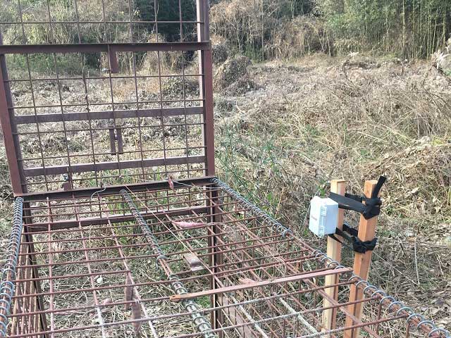 ICTによる檻罠の遠隔監視走査・自動捕獲システム ネットワークカメラ:赤外線ネットワークカメラ 侵入センサー:温度センサー(焦電型赤外線センサー) 最大探知距離5m 検知範囲5m 距離センサー(赤外線センサー)