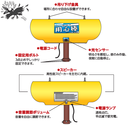光センサーで昼間のみ自動的に作動(1~17分間隔(ランダム)発声時間120秒間) 有効範囲 半径50m〜100m(環境により異なる)