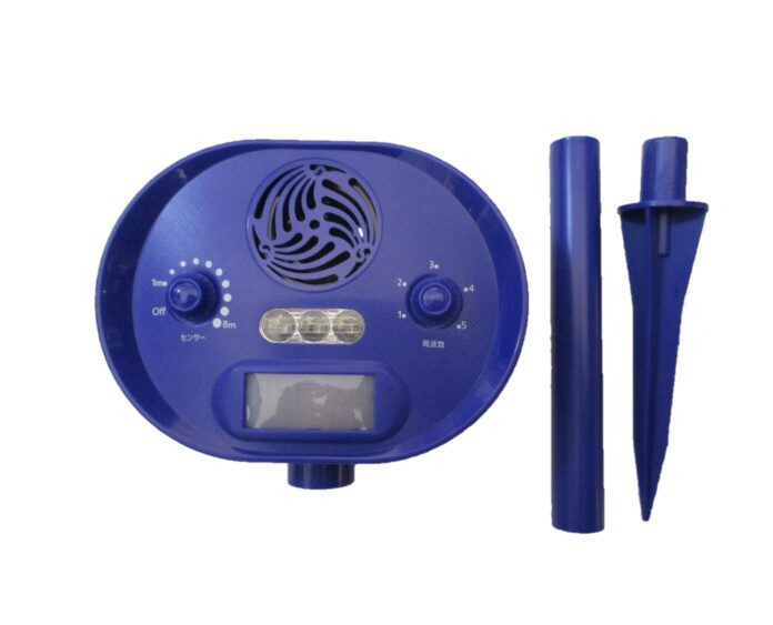 超音波とフラッシュライトで防除 検知方式:赤外線センサー 感知範囲:最大10m 周波数設定範囲:9kHz~46kHz 電源:AC100 ~240V、50/60Hz