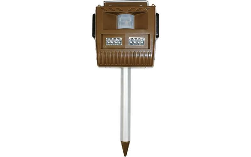 超音波とフラッシュライトで防除 検知方式:赤外線センサー 感知範囲:最大8m 周波数設定範囲:12kHz~35kHz ソーラーパネル発電量:0.75W 電源:単3型×4本 防水レベル:IP44